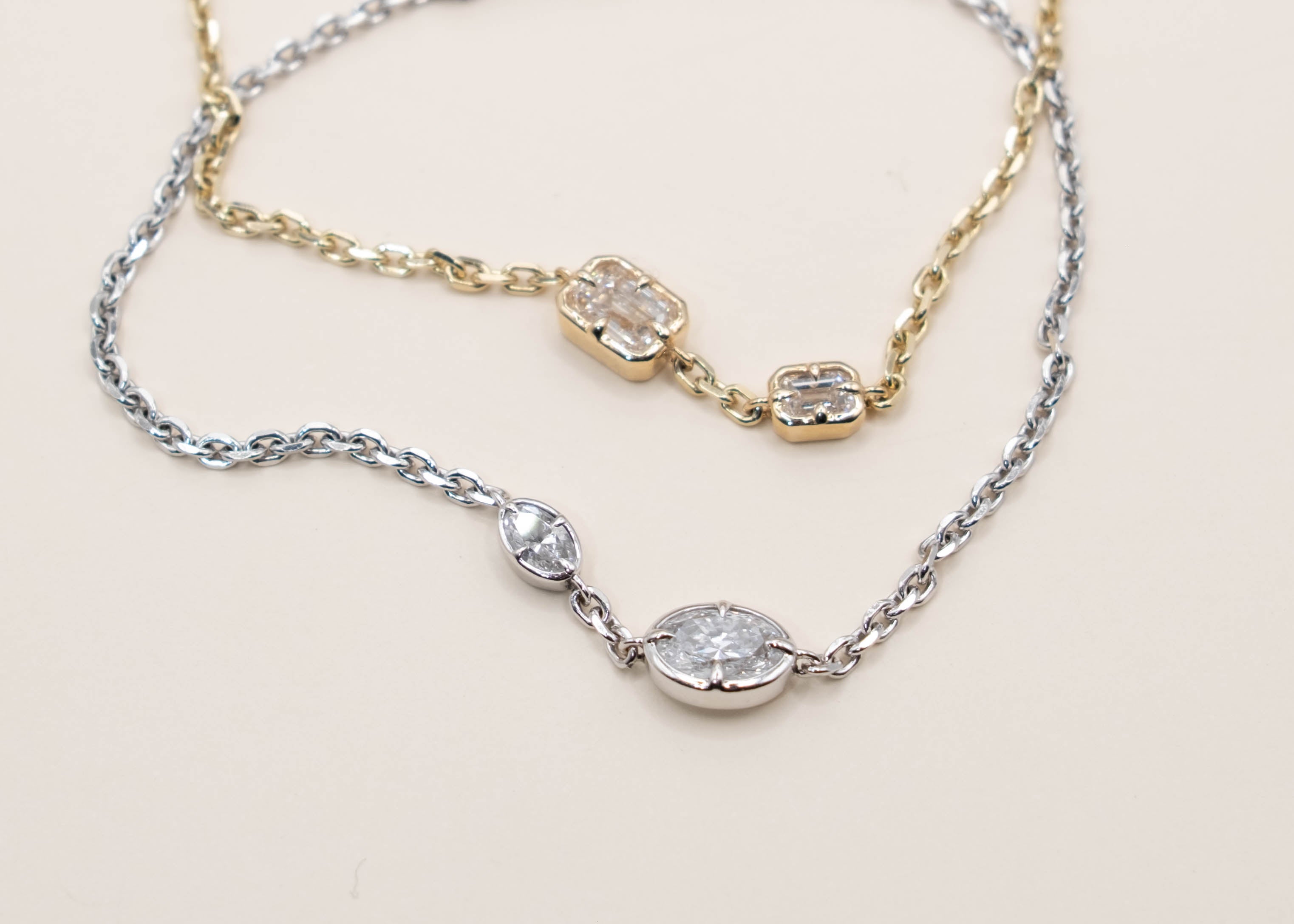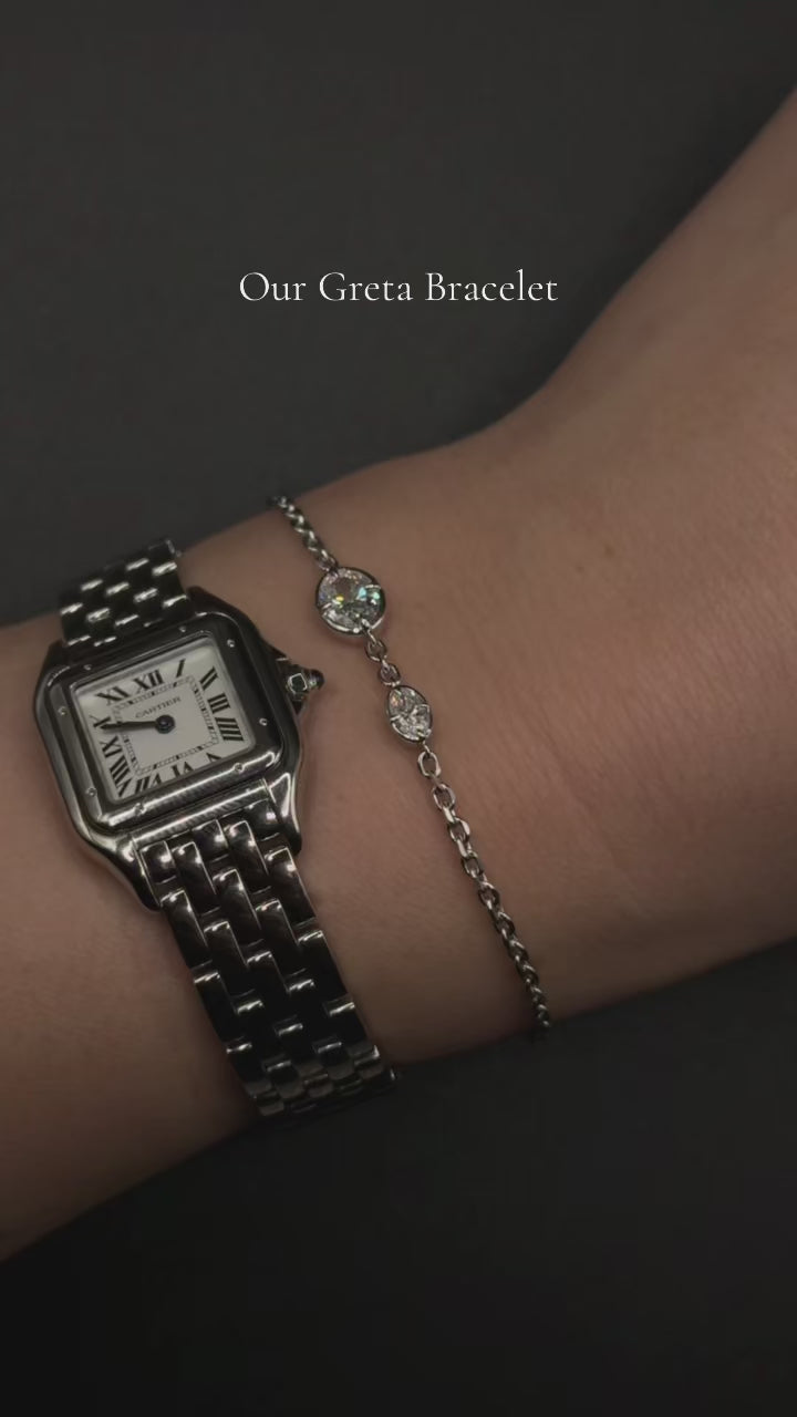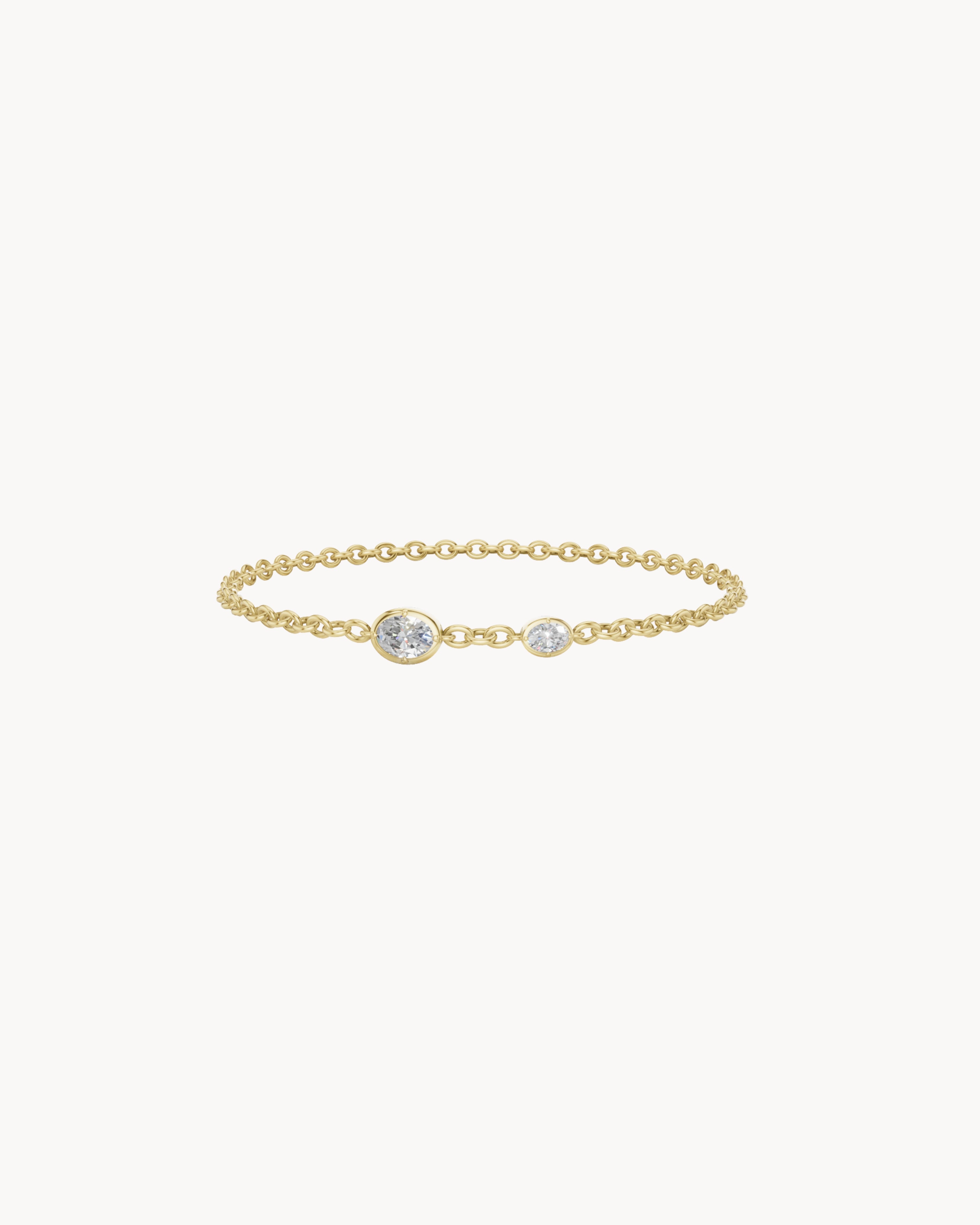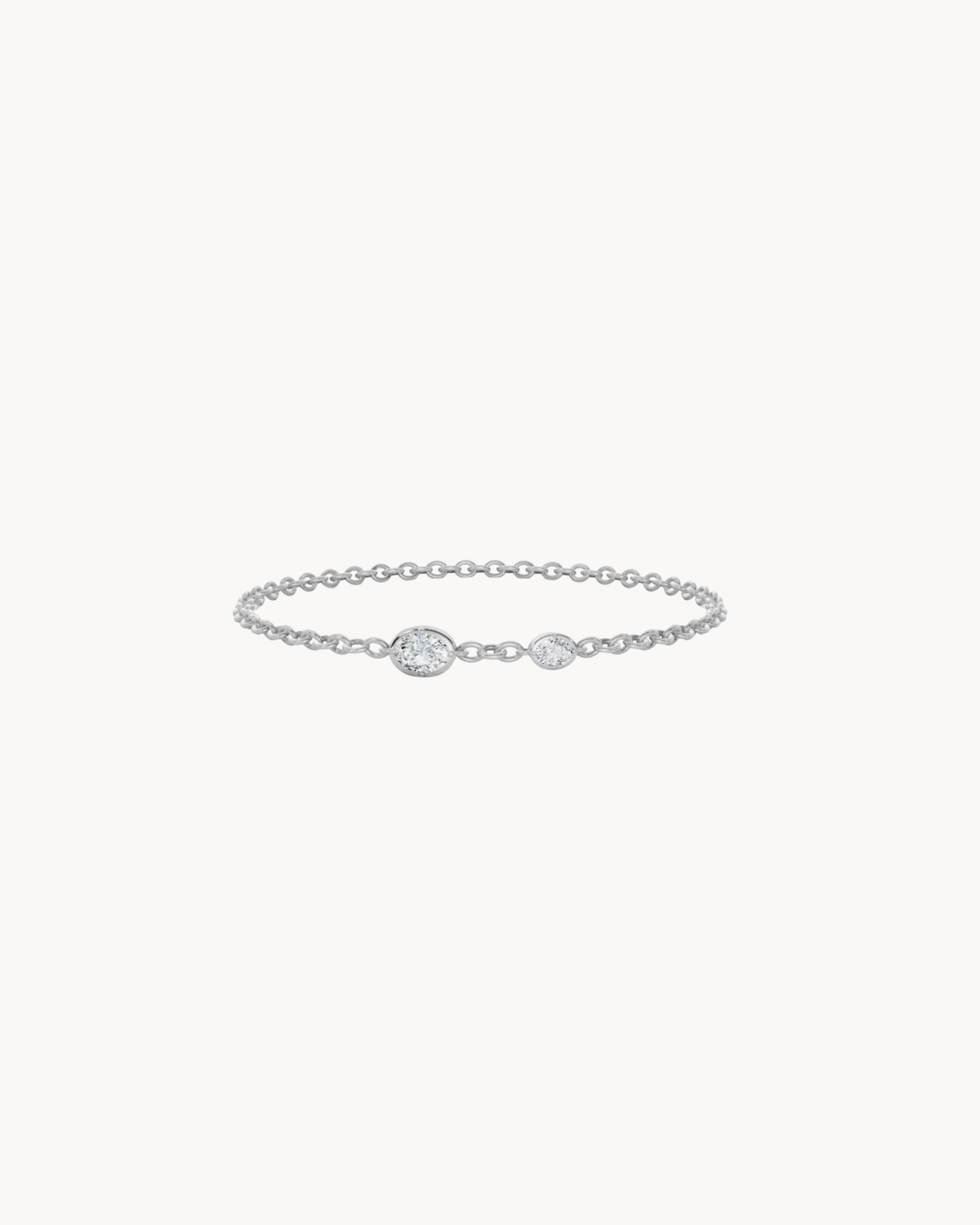 GRETA No. 1 features two lab-grown diamonds bezel-set  with compass prongs along a solid 14k gold chain. With your choice of oval or emerald cuts, the design brings soft structure to an otherwise minimal piece. The result is a refined, lightweight bracelet that feels quietly distinctive.